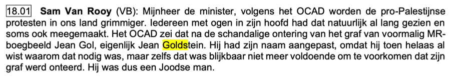 L’obsession du “vrai” nom apparait également dans cette citation de Sam van Rooy, dans laquelle le député du Vlaams Belang mentionne de manière opportuniste la profanation de la tombe de Jean Gol: