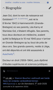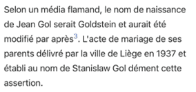 Aux dernières nouvelles, la famille de Jean Gol, ayant apporté à Wikipédia la preuve du nom original en apportant un certificat de l’état civil, s’est vu rétorquer que le certificat est une source primaire moins fiable qu’un article de presse. Actuellement, la page affiche la mention suivante, preuve que les biais de la presse flamande par rapport aux Juifs (que nous avons dénoncé dans ce post) sont du pain bénit pour la mécanique raciste: